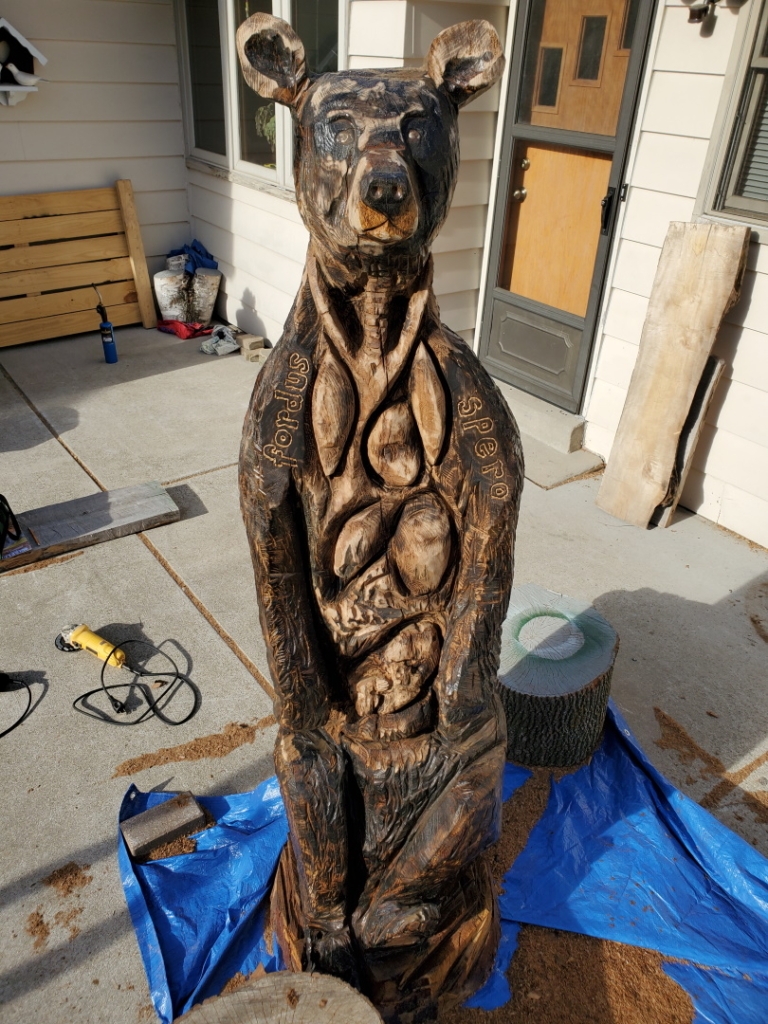 - Medium: Chainsaw carving, sanded, burned, oiled, varnished on Spruce