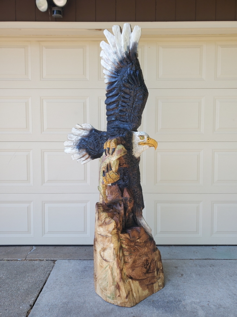 Eagle can be displayed on both sides. Eagles wings are spread, trout fish in talons, soaring over lightly purpled mountains and spruce trees. The carving is just over 6ft. tall.