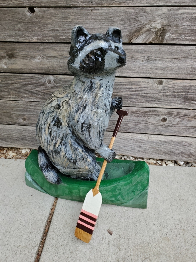 - Medium: Chainsaw and other power tools, paint on Maple (racoon), Spruce (canoe), Pine (paddle) with two coats of spar varnish