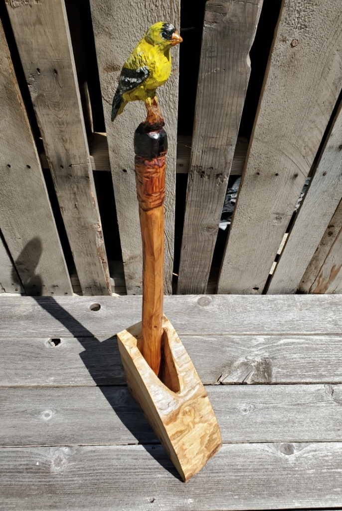 - Goldfinch from beak to tail 6.5 “, 2″ x 31″ pencil, stands 33” in Oak stand, 10 lbs.