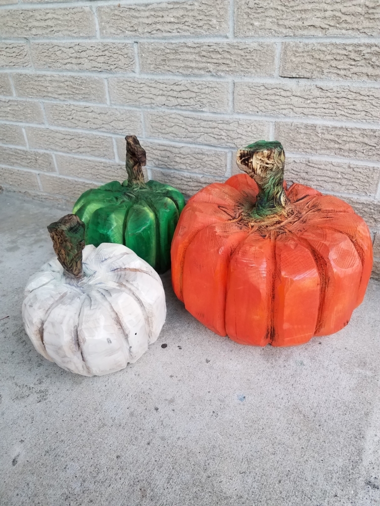 *Pumpkin measurements do not include the stem. Rough carved pumpkins (no sanding, paint/varnish) will be $10 less (each). Special orders or sets may take extra time to fulfill and pricing will be discussed ahead of time. Sets will be priced with a discount. All wood carvings are a part of the austere and rugged nature of the wood and chainsaw; naturally, your piece will be rustic, form cracks, and give the appearance of chainsaw marks. Please see FAQ’s for woodcarving care.