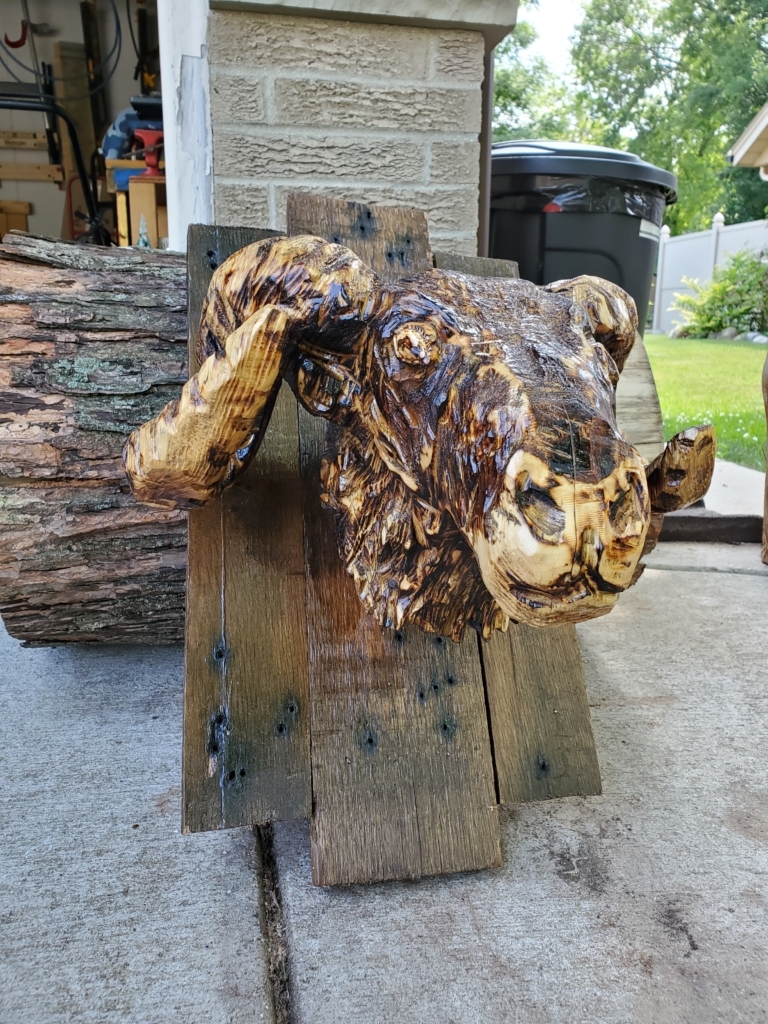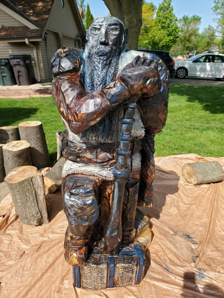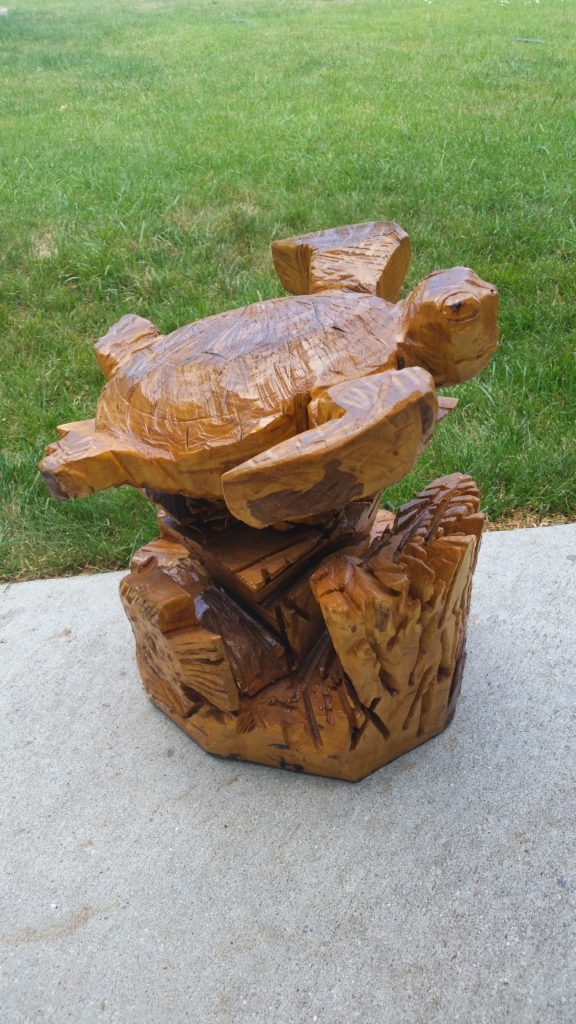 - Medium: Chainsaw carving, sanded, burned, oiled, varnished on Pine