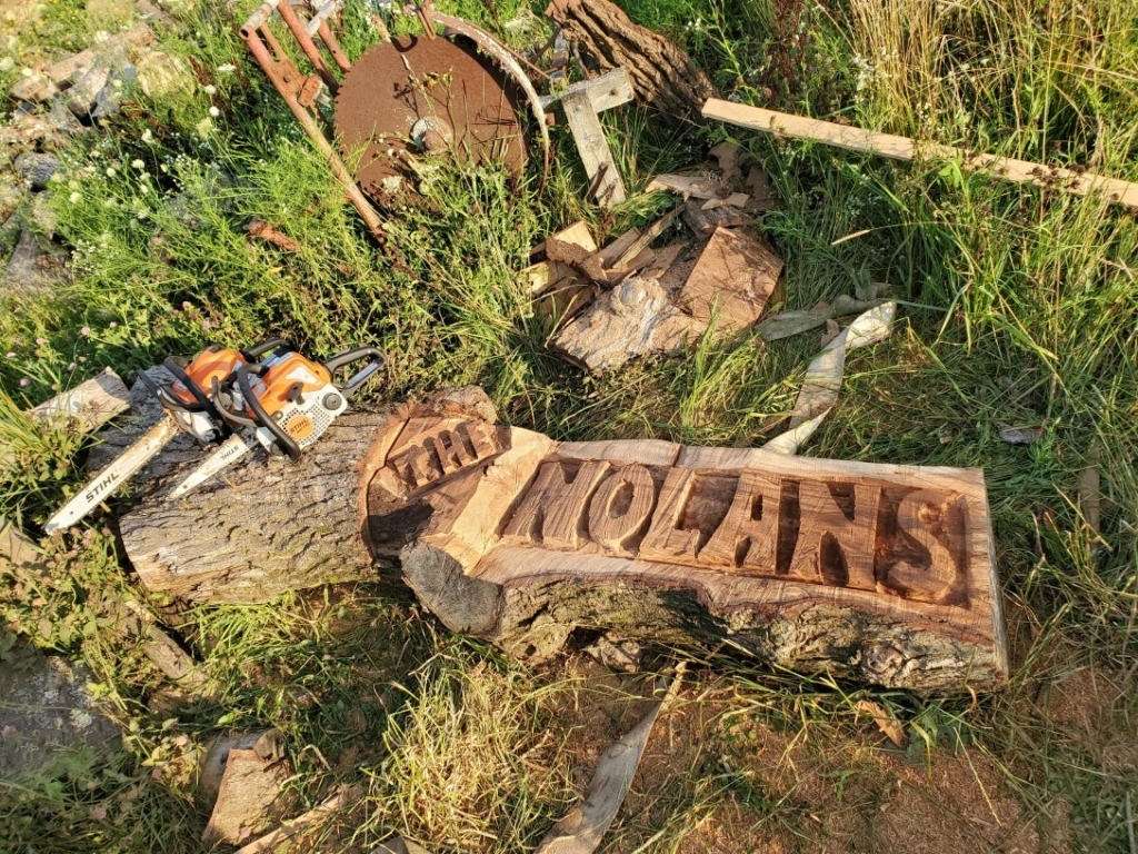 Custom carved name on a log. These will give life to your landscaping or make a great gift! Please refer to pricing guide here.