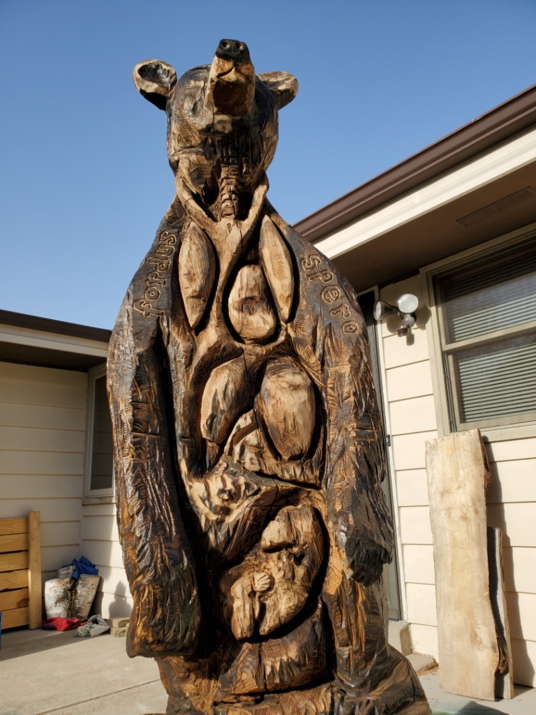- Medium: Chainsaw carving, sanded, burned, oiled, varnished on Spruce