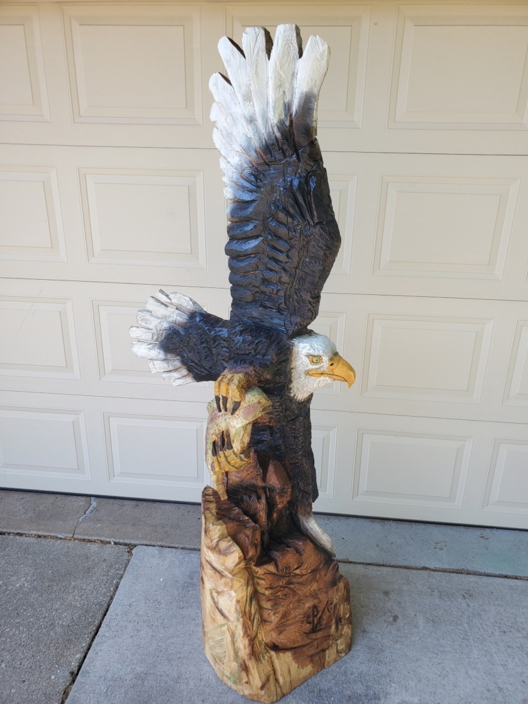 Eagle can be displayed on both sides. Eagles wings are spread, trout fish in talons, soaring over lightly purpled mountains and spruce trees. The carving is just over 6ft. tall.